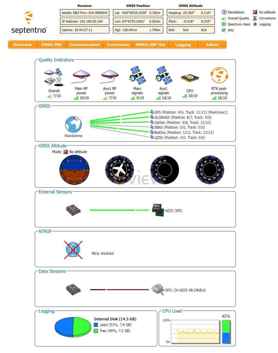 Septentrio’s renowned multi-constellation, multi-frequency RTK is further enhanced by a powerful GNSS/INS integration that allows to have accurate heading, pitch and roll using a single antenna for the most efficient and lean integration. The integrated positioning + orientation solution of AsteRx SBi3 Pro streams out into several wired connectors. With clear marking of the inertial reference point together with a sturdy mounting connector, it is an ideal system for those who are looking for an intuitive GNSS/INS, ready for production.