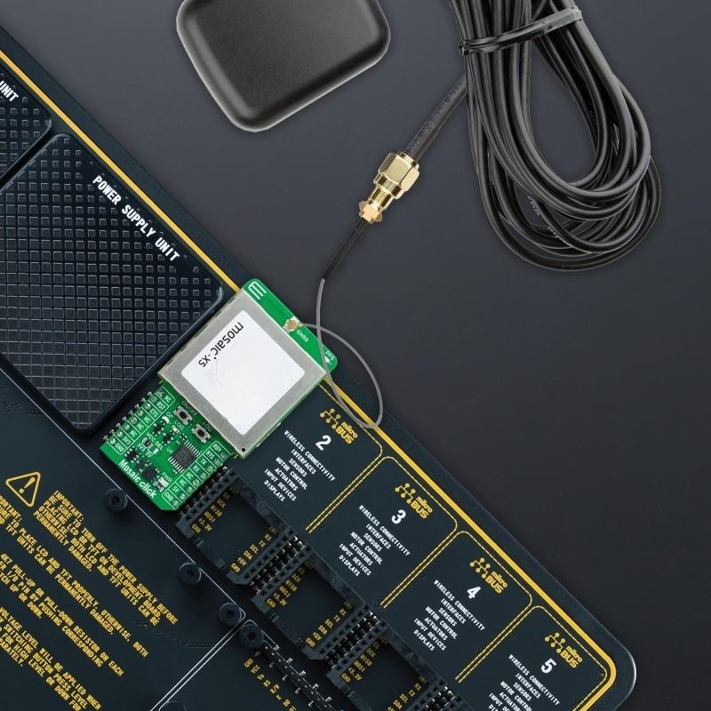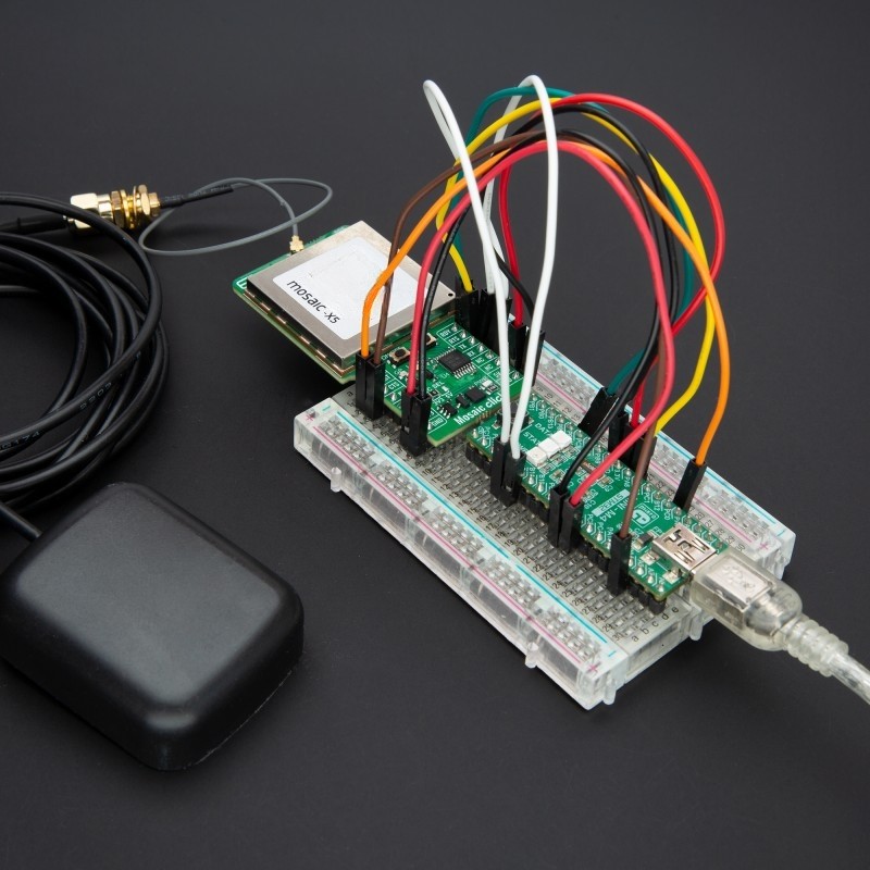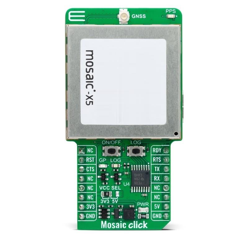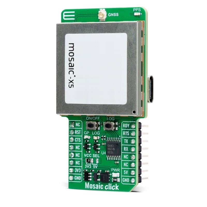 • Mosaic Click is a compact GNSS receiver based on Segmentrio, Mosaic-X5. This receiver provides centimeter level accuracy in multiple bands and satellite constellations such as GPS, GLONASS, Beidou, Galileo, and NavIC.