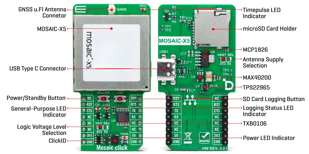 • Mosaic Click is designed specifically for mass market applications such as robotics and autonomous technology, ensuring low power consumption while offering a wide range of interface options and RTK positioning.