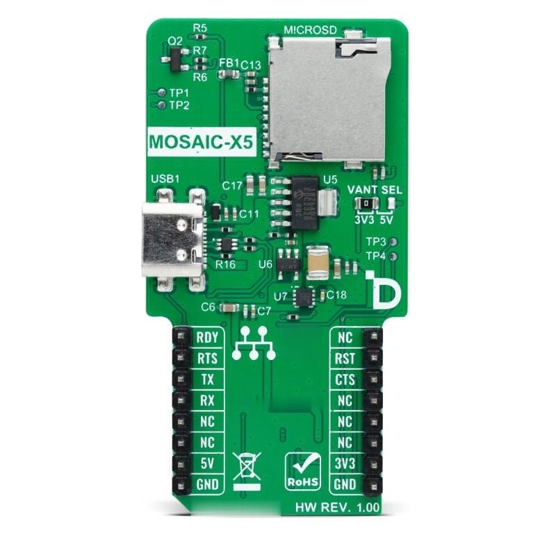• The Mosaic-X5 module has u Fl connectors, such as the active GPS antenna provided by MIKROE, combined with IPEX-SMA cables, provide flexible and efficient connection options. In addition, users can easily choose the power supply for external antennas by selecting between 3.3V and 5V on the VANT SEL jumper.