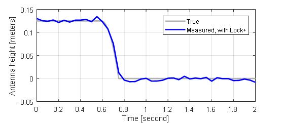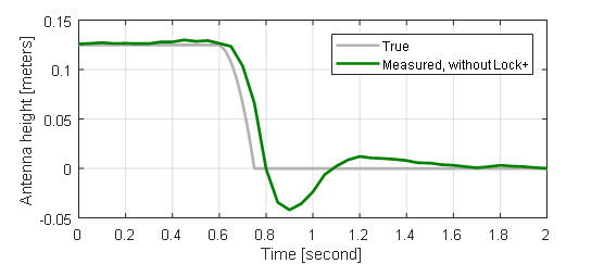 ①LOCK+ significantly decreases the latency and overshoot effects. The next figure shows the results of the same test performed with a Septentrio receiver. The measured position now accurately follows the true position.