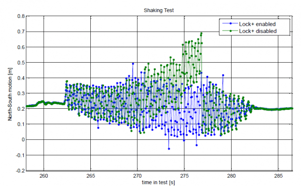The following figure shows the change of latitude reported during strong antenna vibration in the north-south direction. Without LOCK+ (in green) the receiver has difficulties following the rapid changes and the position eventually diverges due to cycle slips. LOCK+ (blue) allows continuous and accurate tracking.